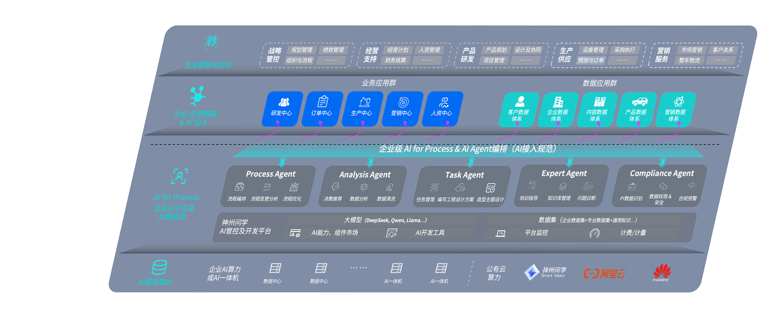 端到端的一站式AI工作空间深度融合了从企业战略规划到日常经营的全流程业务板块,,定向解决车企内部领域多、、部门多、、、、链条长、、场景碎片化等难题,,,支持车企快速构建以AI为核心的生产力写作体系,,实现任务执行与AI能力的无缝集成与交互