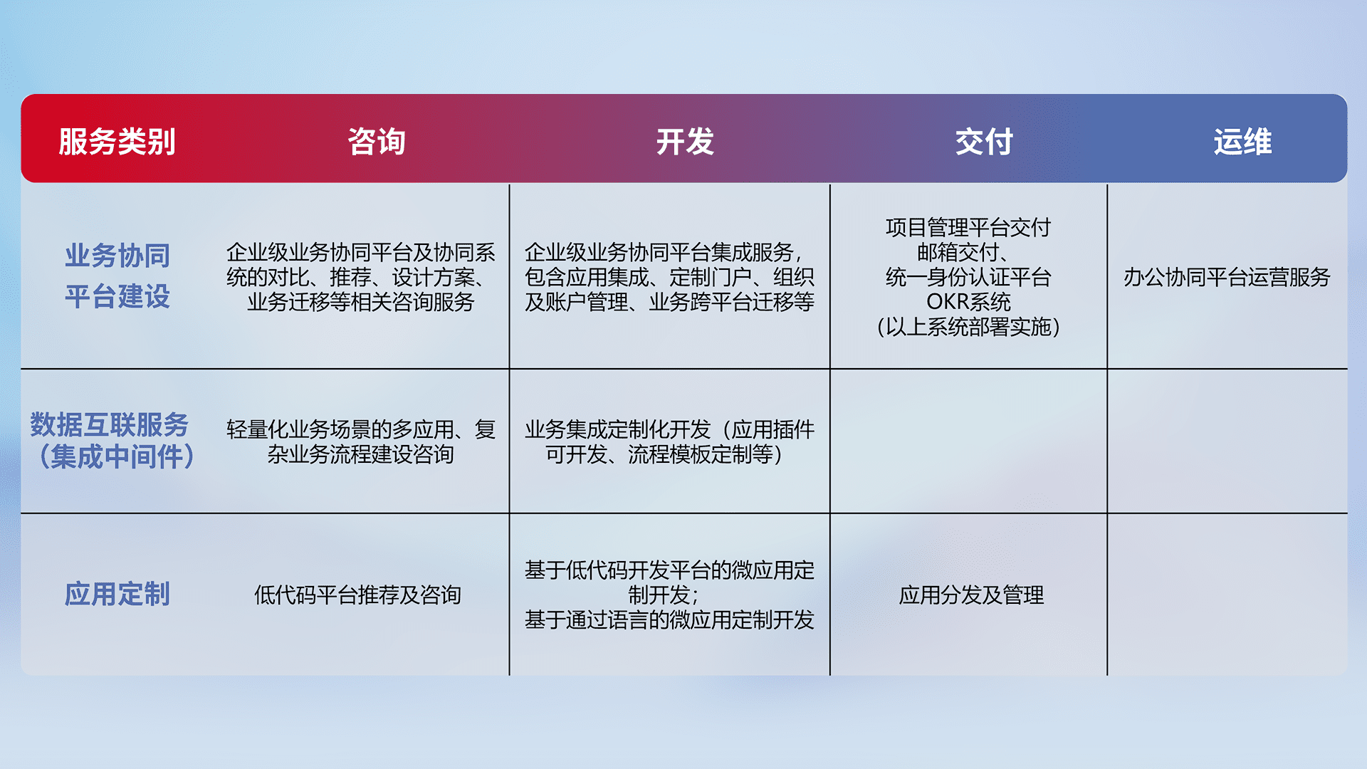 针对钉钉、、、企微、、、、IDaas等平台级产品提供产品的规划、、方案、、、交付、、、、定制化开发等服务,,实现如统一协同办公、、智能客户服务、、混合会议管理、、、智能数据查询、、、、等业务场景,,,实现数字化转型。。